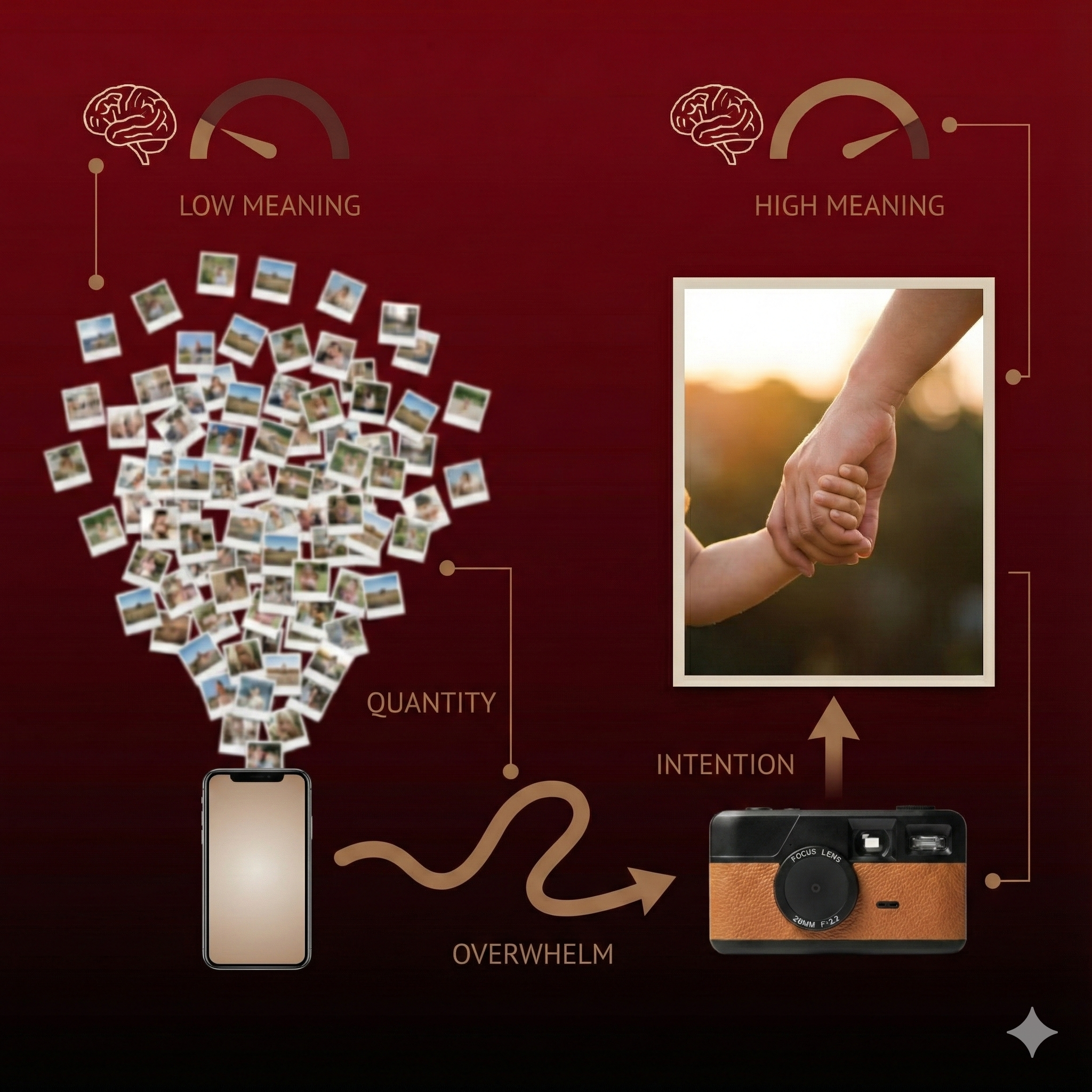 Phones encourage quantity over meaning.You take 50 shots of the same moment — and none feel special.